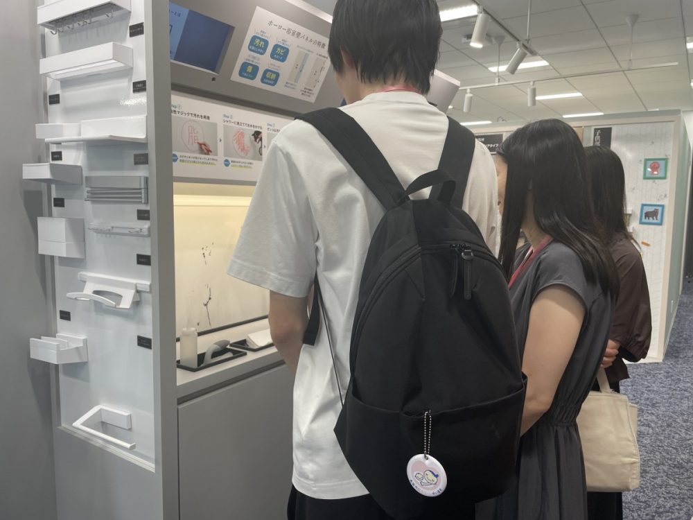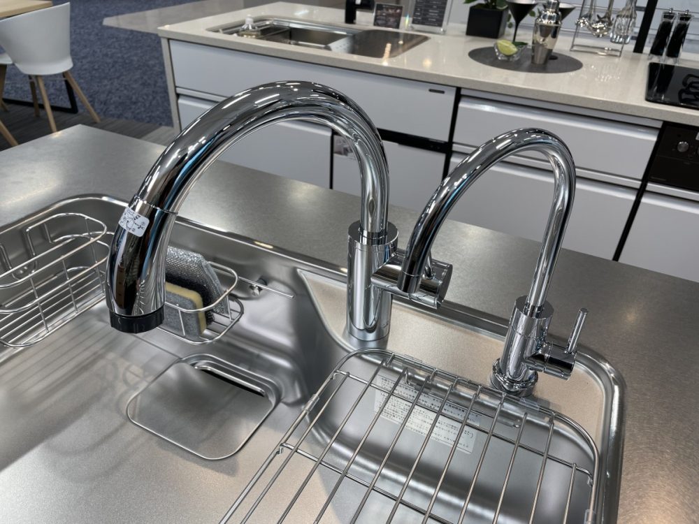 水栓まわりでは、浄水器内蔵型やタッチレス機能付きなど、利便性を追求した製品が多数展示されています。