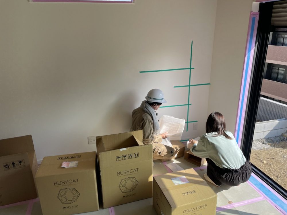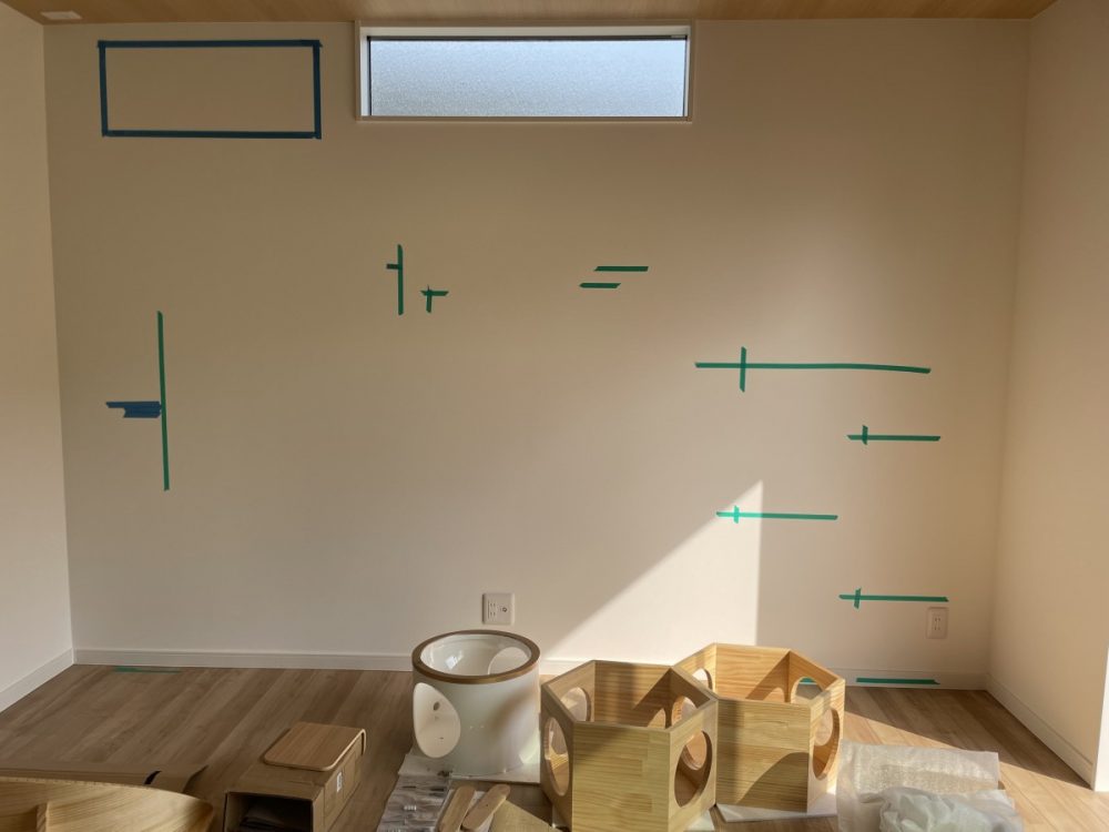 施工前には、マスキングテープで壁に実寸の位置出しを行います。