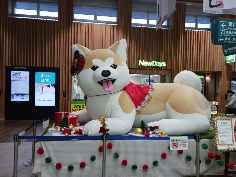 駅前のシンボルでもある秋田犬も、この時期らしくクリスマス仕様に。