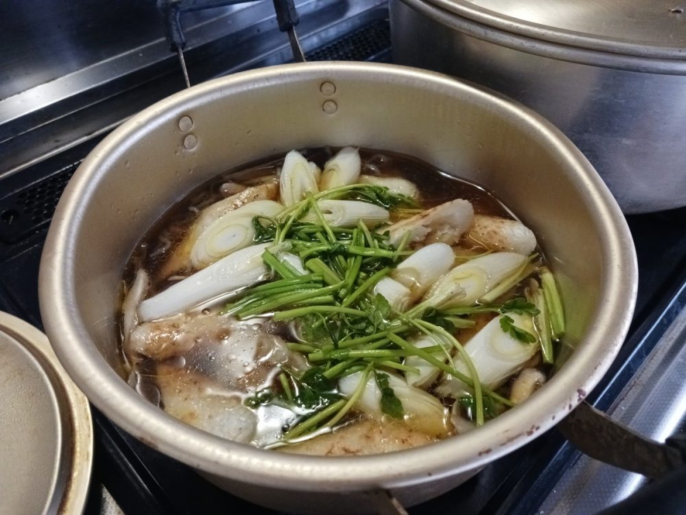 日本三大地鶏のひとつ、比内地鶏を使い、ごぼう、しらたき、舞茸、長ねぎ、せりが入ったきりたんぽ鍋。