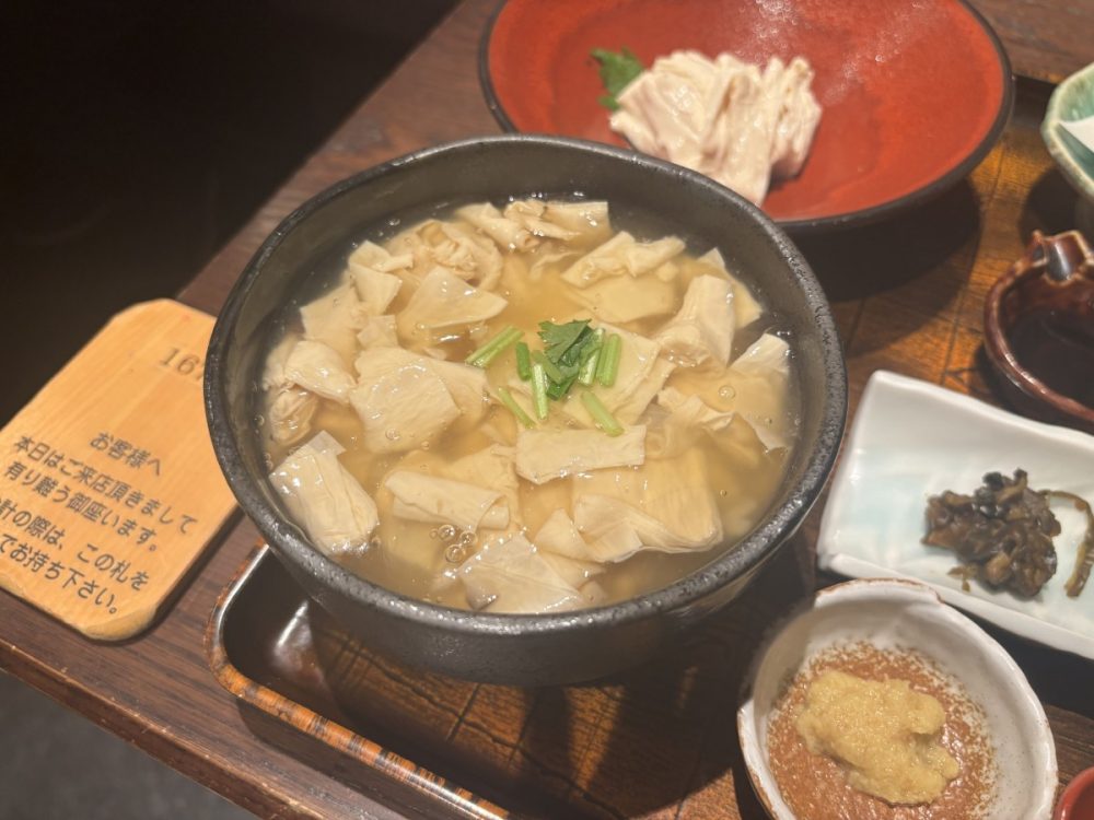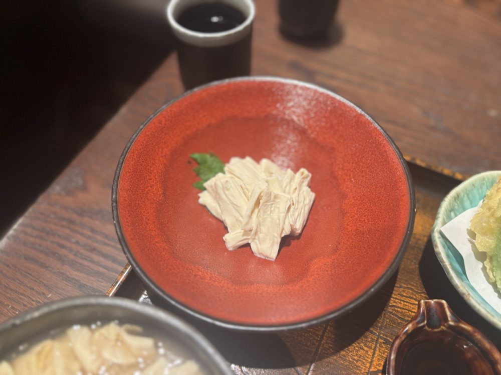 赤い器に盛られた湯葉は見た目も美しく、口に入れると大豆のやさしい甘みが広がります。