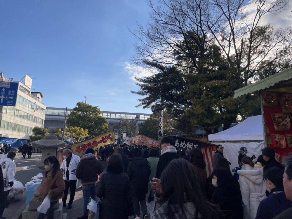 境内を出て駅までの道のりには、ずらりと出店が並び、どこからともなく美味しそうな匂いが漂ってきます。