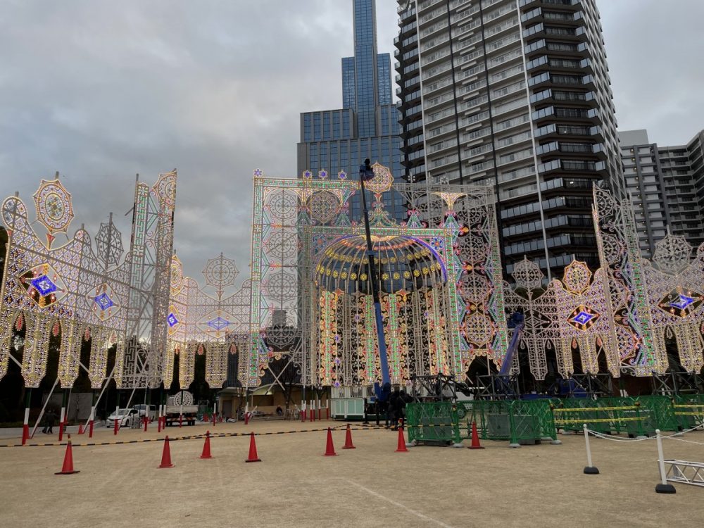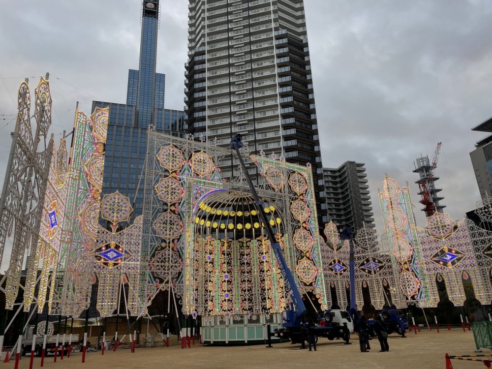 東遊園地ではイルミネーションのメイン作品が設営中でした。