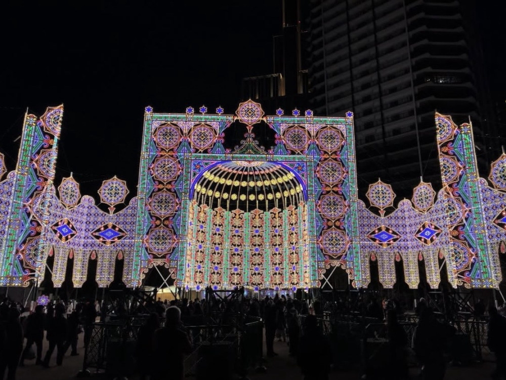 幾何学模様が夜空に映える大迫力のビジュアルで、多くの人が写真撮影ポイントとして訪れるそうです。