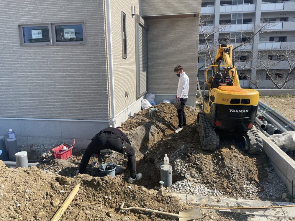 ちょうどそのタイミングで、建物まわりでは敷地内配管工事が急ピッチで進められていました。