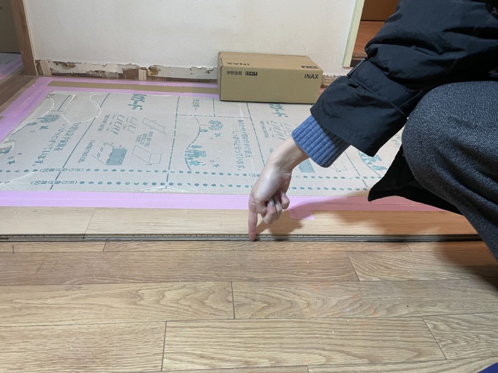 写真は、徳川さんが既存床と新しいフローリングの厚みの違いを確認している場面です。