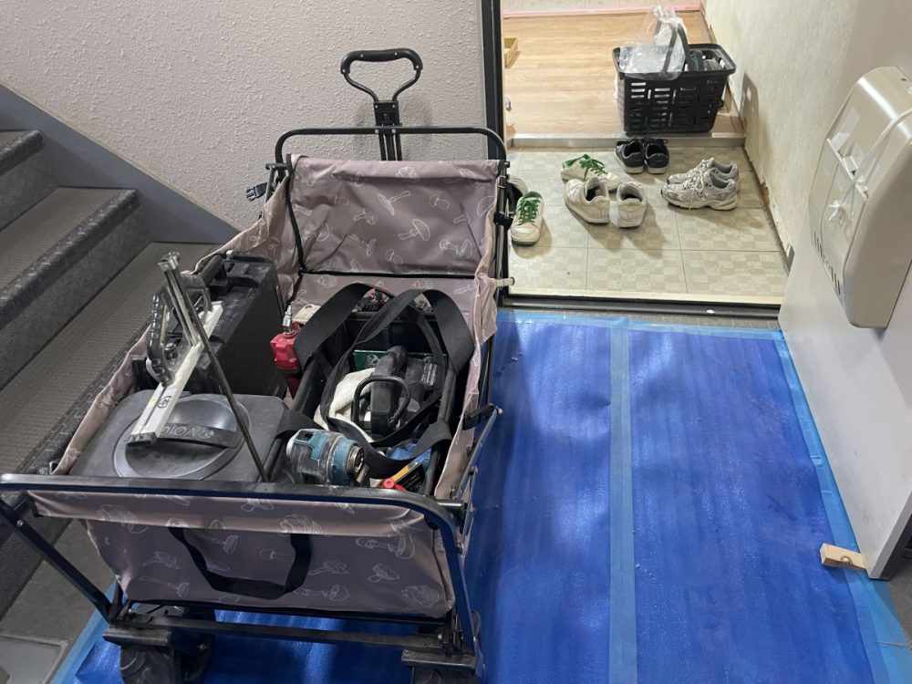 資材の搬入や廃材の搬出の際に共用部分を傷つけてしまわないよう、壁や床を養生材でしっかり保護します。
