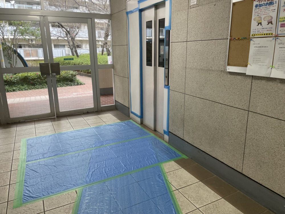 今回の現場でも、工事開始前にエレベーターや共用廊下の養生を行いました。