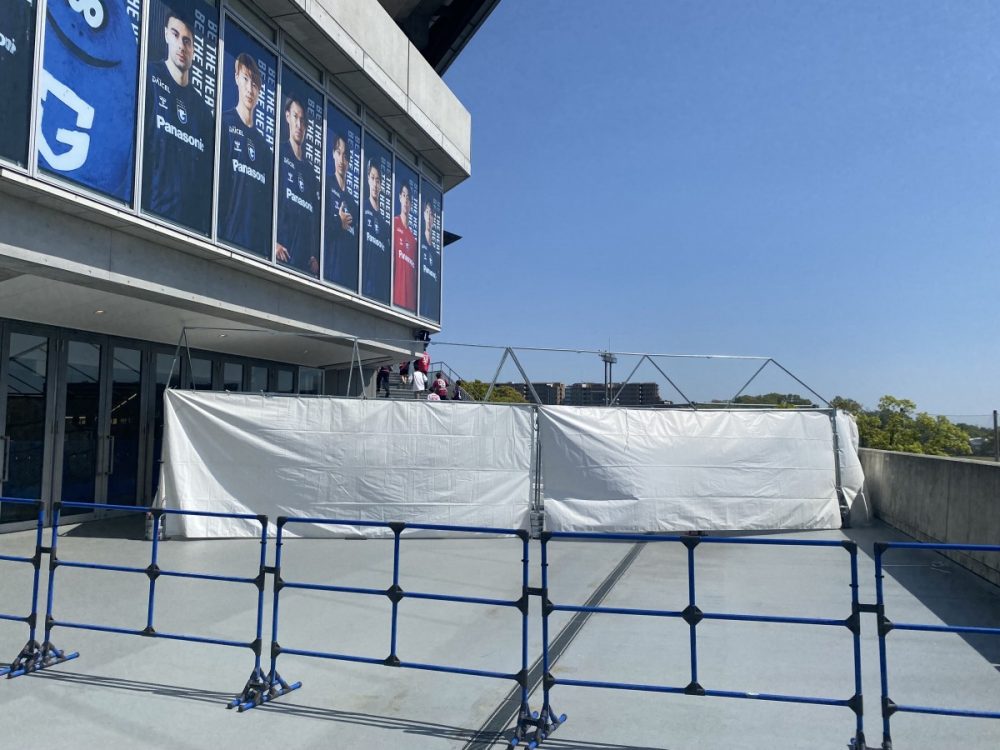大きな幕で仕切られ、隣のチームを応援するサポーターと極力顔を合わせずに済むよう、動線が分けられています。