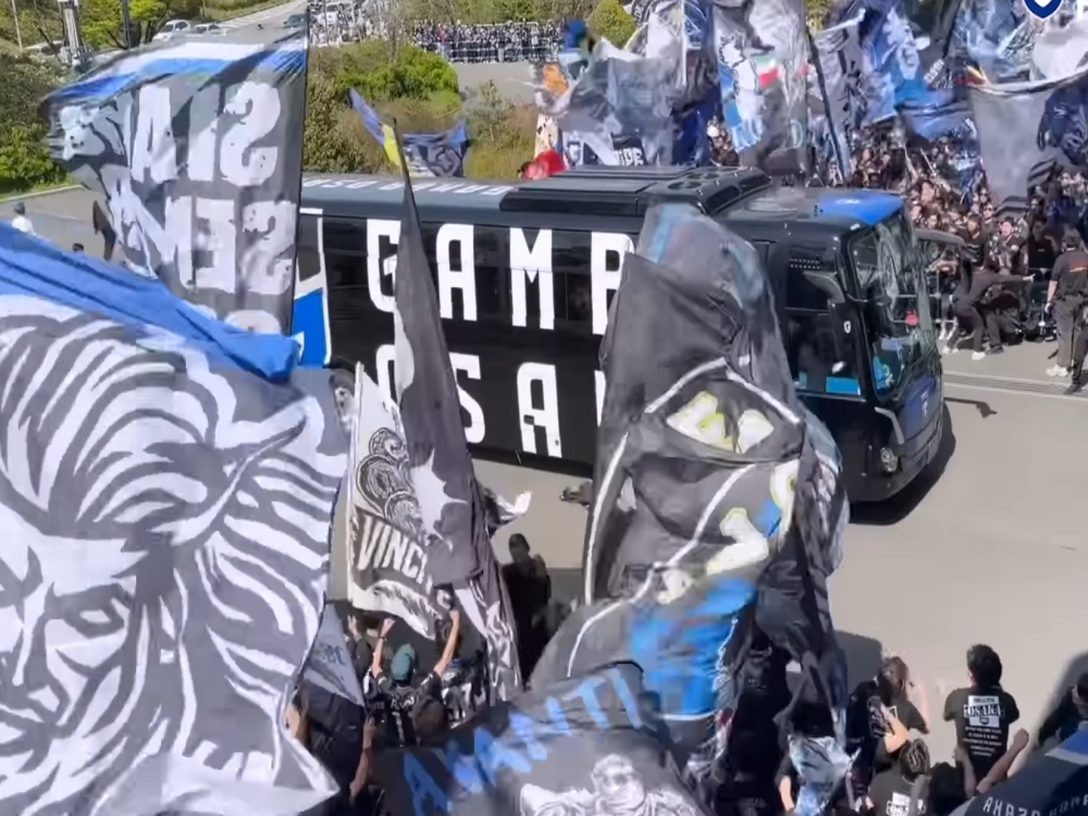 ちょうどそのとき、選手たちを乗せたバスがスタジアムへ到着。