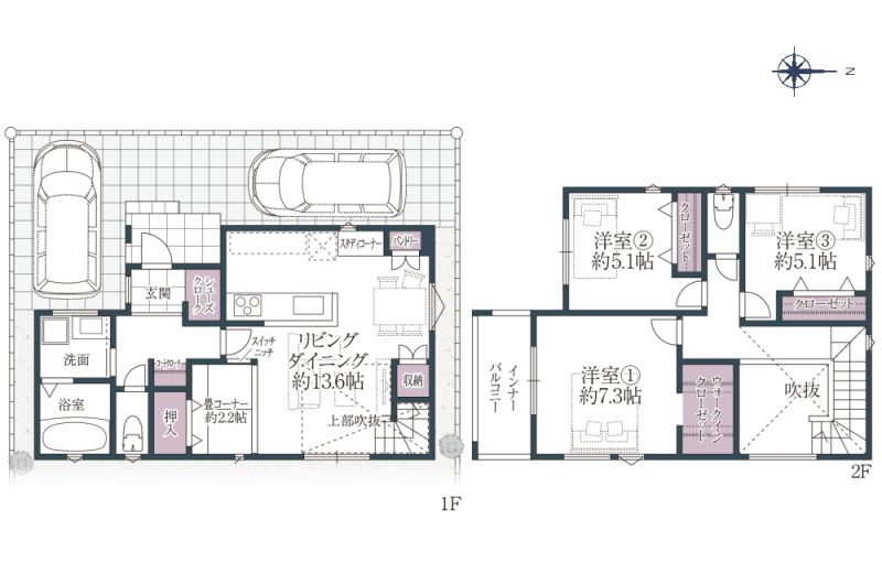 | 特徴 | 日当り良好、吹抜、24時間換気システム、住宅かし保険(10年間)、地盤保証(20年間)、住宅設備保証(10年) | ||