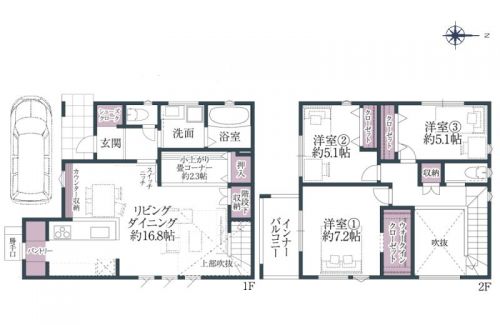| 特徴 | 日当り良好、吹抜、24時間換気システム、住宅かし保険(10年間)、地盤保証(20年間)、住宅設備保証(10年間) | ||